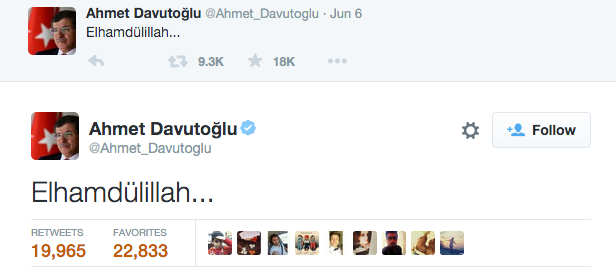 وكتب أوغلو في تغريدة عبر حسابه الرسمي على موقع “تويتر” فور ظهور النتائج الأولية: “الحمد لله”، يُشار إلى أنه بعد فرز نحو 97% من الصناديق الانتخابية، تبين تقدم حزب العدالة والتنمية بحصوله على 49.37% بما يتيح له تشكيل حكومة منفردة.
