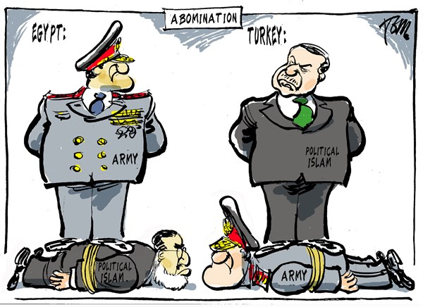 وجاء هذا الرسم ليوضح انتصار الإسلام السياسي على العسكر في تركيا، عكس ما حدث في مصر.