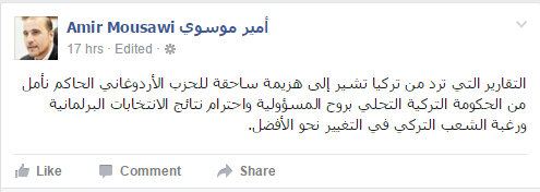 ويوجه سمير حيدر رسالة مقتضبة لـ”موسوي”: “أستاذ أمير فاز حزب أردوغان وباستطاعته تأليف حكومة بأغلبية مطلقة، بدل الثرثرة تعلموا كيف تكون الديمقراطية الحقيقية مو التزوير والكذب”.