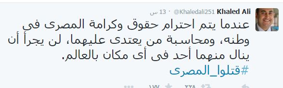 وقال -عبر حسابه على موقع التواصل الاجتماعي “تويتر”-: “عندما يتم احترام حقوق وكرامة المصري في وطنه، ومحاسبة من يعتدي عليهما، لن يجرؤ أن ينال منهما أحد في أي مكان بالعالم.. قتلوا المصري”.