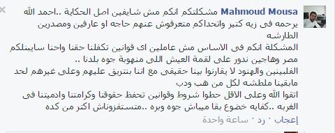 وهاجم Mahmoud Mousa الخارجية بقوله: “مشكلتكم إنكم مش شايفين أصل الحكاية.. احمد الله يرحمه فى زيه كتير واتحداكم متعرفوش عنهم حاجة أو عارفين ومصدرين الطارشة.. المشكلة إنكم في الأساس مش عاملين أي قوانين تكفلنا حقنا واحنا سايبين مصر وهاجين ندور على لقمة العيش اللي منهوبة جوه بلدنا. وأضاف “الفلبينيين والهنود لا يقارنوا بينا حقيقي مع إننا بنتريق عليهم وعلى غيرهم لحد مابقينا ملطشة لكل من هب ودب.. اتقوا الله وعلى الأقل حطوا شروط وقوانين تحفظ حقوقنا وكرامتنا وادميتنا فى الغربة ..كفاية خضوع بقا ميبقاش جوه وبره.. متستفزوناش أكتر من كده”.