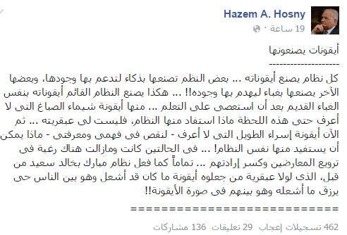وكتب “حسني”، في منشور له عبر صفحته الرسمية على موقع “فيس بوك”: “كل نظام يصنع أيقوناته.. بعض النظم تصنعها بذكاء لتدعم بها وجودها، وبعضها الآخر يصنعها بغباء ليهدم بها وجوده!! هكذا يصنع النظام القائم أيقوناته بنفس الغباء القديم بعد أن استعصى على التعلم، منها أيقونة شيماء الصباغ التي لا أعرف حتى هذه اللحظة ماذا استفاد منها النظام، فليست لي عبقريته”.