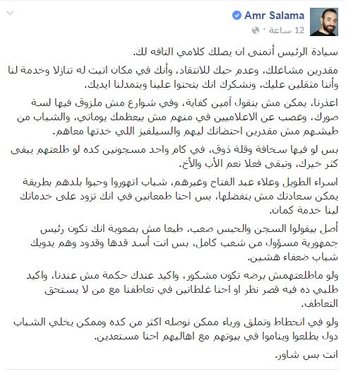 كتب “سلامة” -في رسالته التي نشرها عبر صفحته الرسمية على موقع “فيس بوك”-: “سيادة الرئيس أتمنى أن يصلك كلامي التافه لك.. مقدرين مشاغلك، وعدم حبك للانتقاد، وأنك في مكان أتيت له تنازلًا وخدمة لنا وأننا مثقلين عليك، ونشكرك أنك بتحنو علينا وبتمدلنا إيديك”.