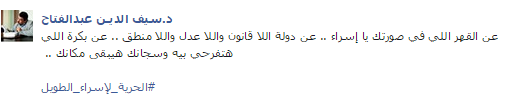 قال “عبدالفتاح” -في منشور له عبر صفحته الرسمية على موقع”فيس بوك”-: “عن القهر اللي في صورتك يا إسراء.. عن دولة اللا قانون واللا عدل واللا منطق.. عن بكره اللي هتفرحي بيه وسجانك هيبقى مكانك”.
