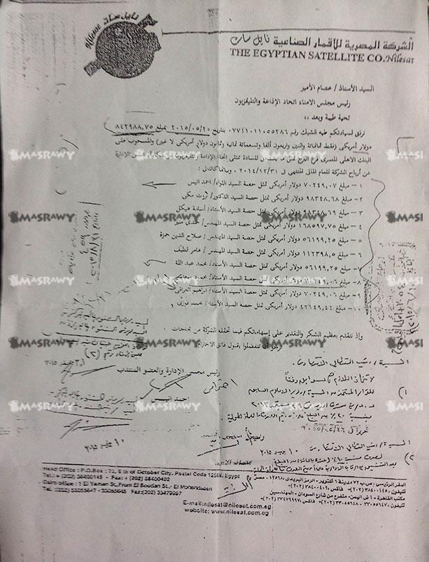 كشفت مستند رسمي عن المبالغ التي تقاضاها قيادات تمثل مجلس أمناء اتحاد الإذاعة والتلفزيون في الشركة المصرية للأقمار الصناعية (نايل سات) في صورة ”مكافآت” عن أرباح حققتها الشركة في العام المنتهي آخر ديسمبر 2014.