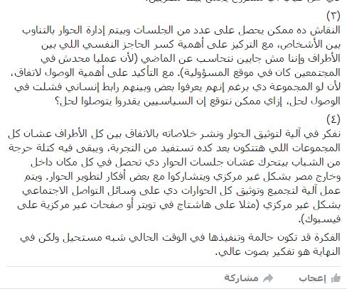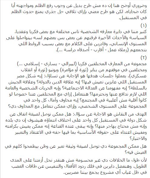 واقترح عمل جلسات مع المعارف والأهل والأصدقاء رغم الاختلاف الفكري، عن شكل مصر المستقبل، وعلاقة الدين بالدولة وعلاقة الجيش بالسلطة، ومفهوم العدالة الاجتماعية؟ والحريات الشخصية والعامة، وكيفية التعامل مع الأقليات، وذلك لمعرفة كيف يمكن الوصول إلى صيغة اتفاق عن شكل الدولة في المستقبل.