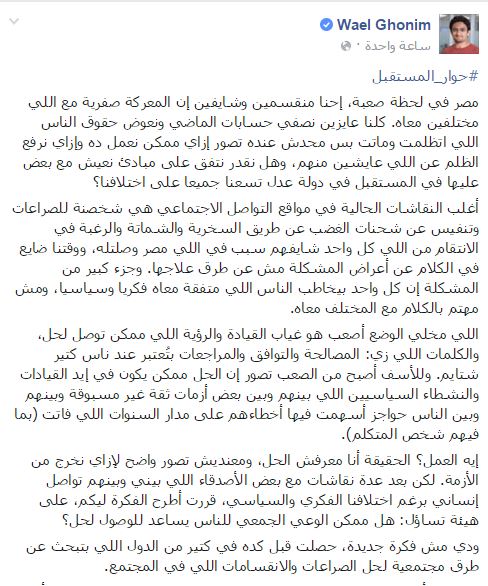 طرح الناشط السياسي، وائل غنيم، فكرة الحوار المجتمعي كحل لمحاولة الخروج من الأزمة الراهنة، وذلك عن طريق إجراء حوارات نقاشية خلال عدد من الجلسات بين الأصدقاء والأهل والمعارف المختلفين فكريًا للإجابة عن تساؤلات يتم من خلالها الوصول لرؤية عن مصر التي يريدها الجميع رغم اختلافه الفكري.