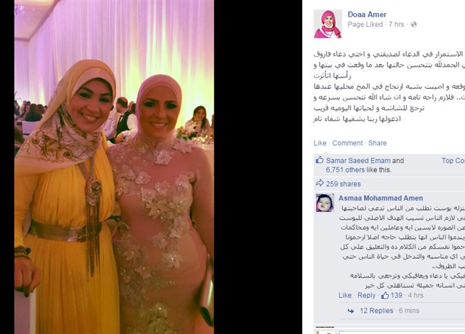 وكانت دعاء قد نشرت على موقع التواصل الاجتماعي فيس بوك، صورة لها مع صديقتها الإعلامية دعاء فاروق، راجية الدعاء لها بعد إصابتها بارتجاج في المخ إثر سقوطها في منزلها وفقدانها توازنها.