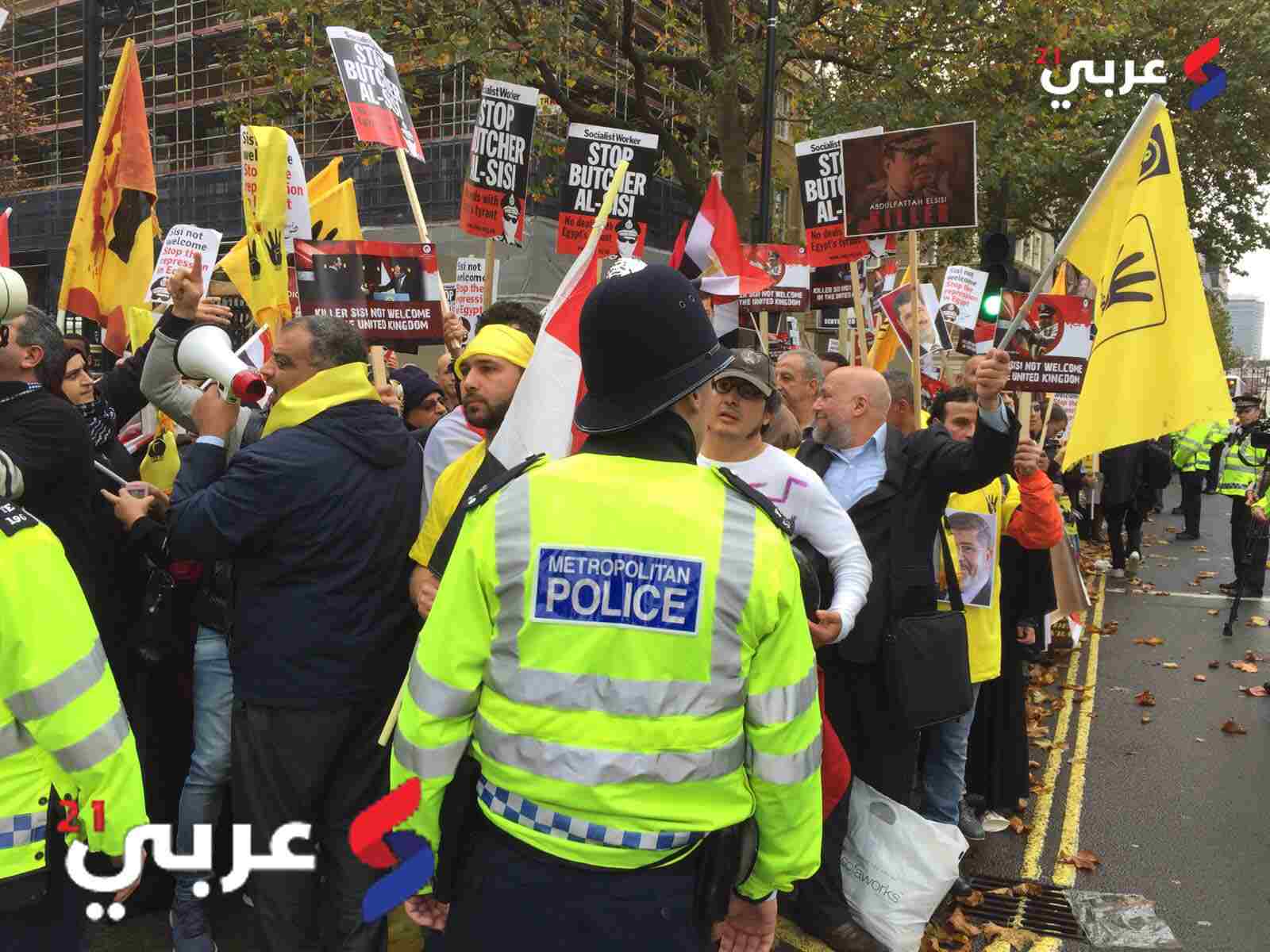 وتعرض عدد من المحتجين للاعتداء من قبل رجال أمن السيسي الذين كانوا يرتدون الملابس المدنية، إلا أن الشرطة البريطانية فضت اشتباكات متفرقة وقعت بين الطرفين.