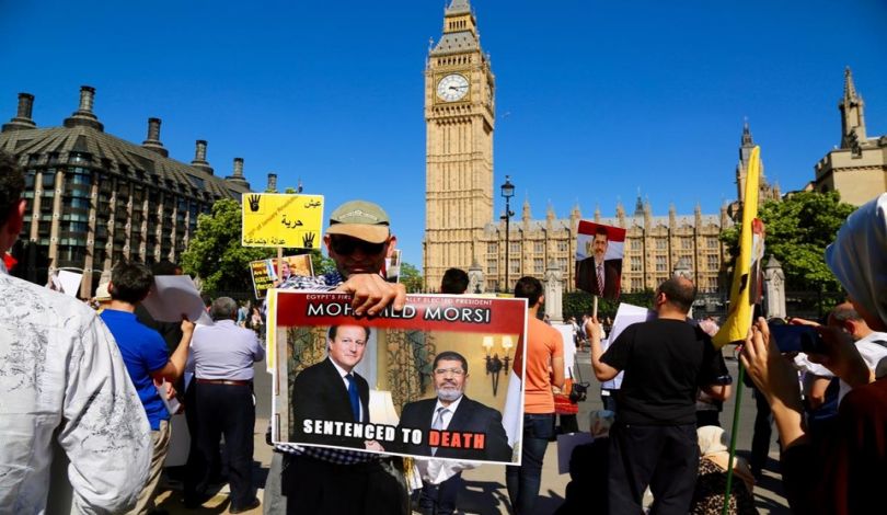 وردد المتظاهرون شعارات باللغتين الانكليزية والعربية، من قبيل “لا نريد دولة عسكر” “السيسي قتل الديمقراطية” “كاميرون اخجل من نفسك، ماذا عن القيم البريطانية؟”.
