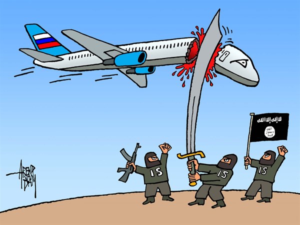 ونشر نفس الموقع أيضا هذا الرسم ساخرا من إعلان تنظيم الدولة مسؤوليته عن إسقاط الطائرة الروسية في سيناء: