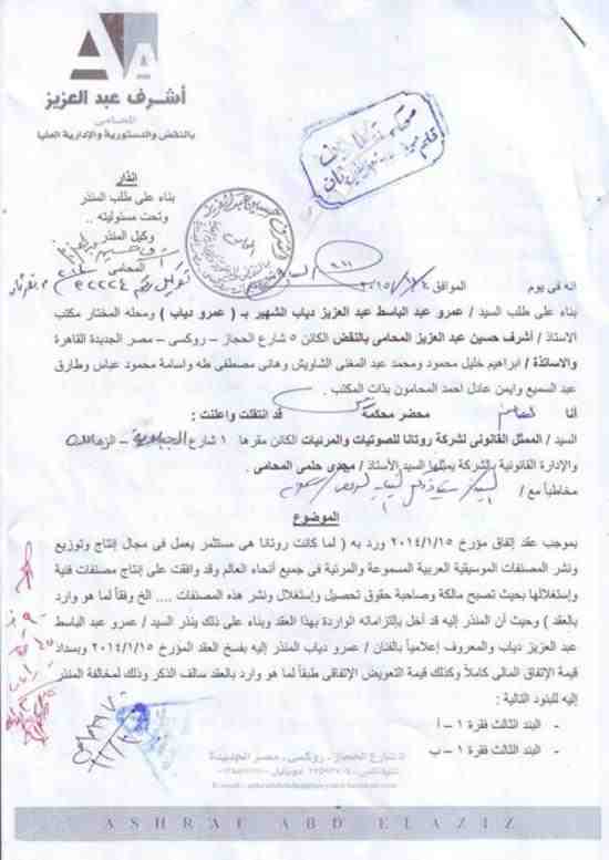 وتابع: “وقد تم توجيه الإنذار بتاريخ 3/11/2015 برقم 18998 قلم محضر قصر النيل أوضح فيه مخالفة شركة روتانا لبنود عقد الإتفاق المؤرخ 15/1/2014“.