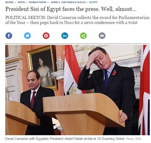 ورأت الصحيفة أن السيسي لا بد أن يشعر بالامتنان؛ لأن كاميرون أعطاه جزءًا من وقته في يوم حافل بالأحداث المهمة؛ فقد ترك كاميرون السيسي في منتصف الزيارة في مقره لمدة ساعة وذهب لتسلم جائزة أفضل برلماني هذا العام، ثم رجع لحضور مؤتمره الصحفي مع السيسي.