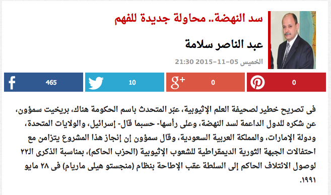 وأشار “سلامة” -في مقال نشر بصحيفة “المصري اليوم”- إلى تصريحات المتحدث باسم الحكومة الإثيوبية، بريخيت سمؤون، لصحيفة “العلم” الإثيوبية، والتي عبر فيها عن شكره لإسرائيل والولايات المتحدة والإمارات والسعودية، لمساهمتهم في إنشاء المشروع.
