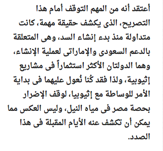 واعتبر سلامة أنه “من المهم التوقف أمام هذا التصريح، الذى يكشف حقيقة مهمة، كانت متداولة منذ بدء إنشاء السد، وهي المتعلقة بالدعم السعودي والإماراتي لعملية الإنشاء، وهما الدولتان الأكثر استثمارًا في مشاريع إثيوبية”، موضحًا أن مصر كانت تعول عليهما في بداية الأمر للوساطة مع إثيوبيا؛ لوقف الإضرار بحصة مصر في مياه النيل، و”ليس العكس مما يمكن أن تكشف عنه الأيام المقبلة في هذا الصدد”.