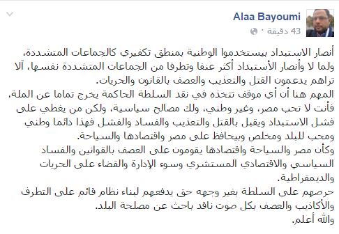 وقال -عبر منشور له على “فيس بوك”-: “أنصار الاستبداد بيستخدموا الوطنية بمنطق تكفيري كالجماعات المتشددة، ولم لا وأنصار الأستبداد أكثر عنفا وتطرفا من الجماعات المتشددة نفسها، آلا تراهم يدعمون القتل والتعذيب والعصف بالقانون والحريات؟”.