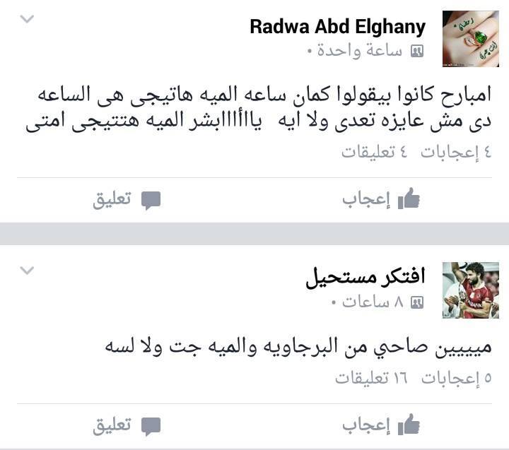 وقالت رضوى عبد الغني: “امبارح كانوا بيقولوا كمان ساعة الميه هتيجي، هي الساعة ده مش عايزة تعدي ولا ايه يابشر، الميه هتيجي امتى”.