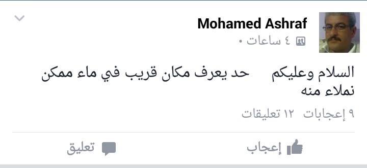 وسأل محمد أشرف، عبر صفحته على “فيس بوك”، أصدقاءه عن مكان يستطيع منه ملء المياه، قائلاً: “حد يعرف مكان قريب في ماء ممكن نملأ منه”.