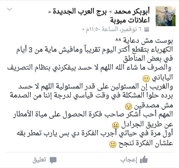 وبسخرية، وصف أبو بكر محمد، الحالة التي يعيش فيها مواطنو برج العرب، قائلاً: “الكهربا بتقطع أكتر اليوم تقريبا، ومفيش ميه من 3 أيام في بعض المناطق، والصرف ما شاء الله اللهم لا حسد بيفكرني بنظام التصريف الياباني، والغريب إن المسؤولين على قدر المسؤولية اللهم لا حسد، برده حلوا المشكلة في وقت قياسي، لدرجة إننا من الصدمة مش مصدقين”.
