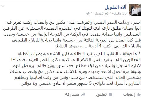 وأضافت في منشور لها عبر “فيس بوك”: إن الطبيب أصدر تقريرًا أكد خلاله أنها أصيبت بطلق ناري أدی لتهتك في الضفيرة العصبية المسؤولة عن الطرفين السفليين، وأنها مصابة بضعف في الركبة من الدرجة الرابعة من خمس وضعف في كف القدم من الدرجة الثالثة من خمسة، وأنها بحاجة للعلاج الطبيعي والعلاج الدوائي.