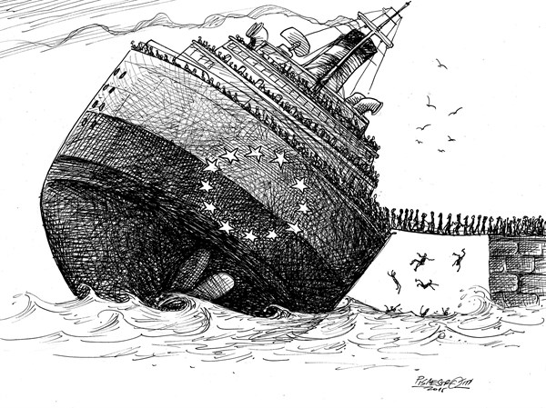 ونشر موقع “بولتيكال كارتونز” هذا الرسم عن امتلاء سفينة الأمم المتحدة باللاجئين: