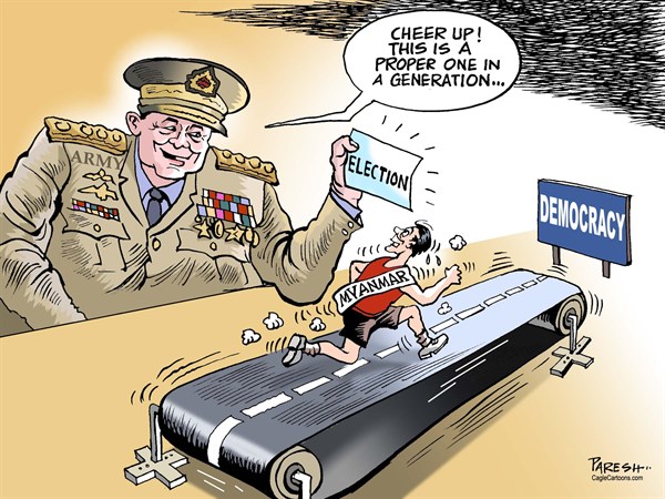 ونشر “بولتيكال كارتونز” أيضا هذا الرسم عن انتخابات ميانمار البرلمانية في ظل السطوة العسكرية:
