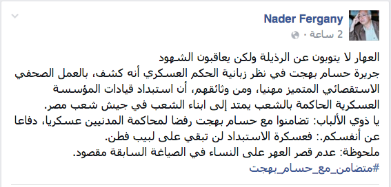 وذكر فرجاني في منشور له عبر حسابه الشخصي على موقع التواصل الاجتماعي “فيس بوك” أن جريمة حسام بهجت في نظر زبانية الحكم العسكري أنه كشف، بالعمل الصحفي الاستقصائي المتميز مهنيًا، ومن وثائقهم، أن استبداد قيادات المؤسسة العسكرية الحاكمة بالشعب يمتد إلى ابناء الشعب في جيش شعب مصر.