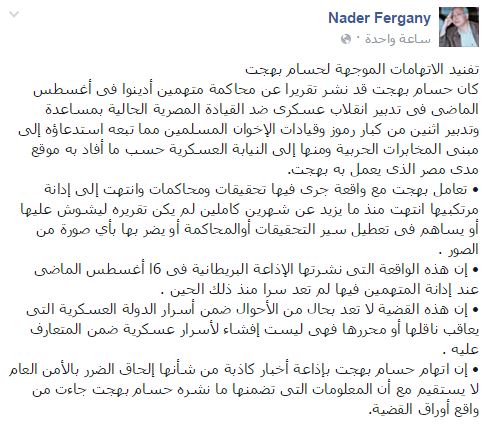 ونقل “فرجاني” -عبر منشور له على “فيس بوك”- ما أفاد به موقع “مدى مصر”، الذي يعمل به بهجت، أنه قد نشر تقريرًا عن محاكمة متهمين أدينوا في أغسطس الماضي في تدبير انقلاب عسكري ضد القيادة المصرية الحالية بمساعدة وتدبير اثنين من كبار رموز وقيادات الإخوان المسلمين مما تبعه استدعاؤه إلى مبنى المخابرات الحربية ومنها إلى النيابة العسكرية.