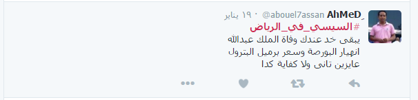 وعلق أحمد: “يبقى خد عندك وفاة الملك عبدالله، انهيار البورصة وسعر برميل البترول، عايزين تاني ولا كفاية كدا” في إشارة إلى التشاؤم من زيارة السيسي للسعودية.