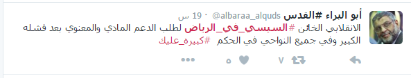 وقال أبو البراء: “الانقلابي الخائن السيسي في الرياض لطلب الدعم المادي والمعنوي بعد فشله الكبير وفي جميع النواحي في الحكم”.