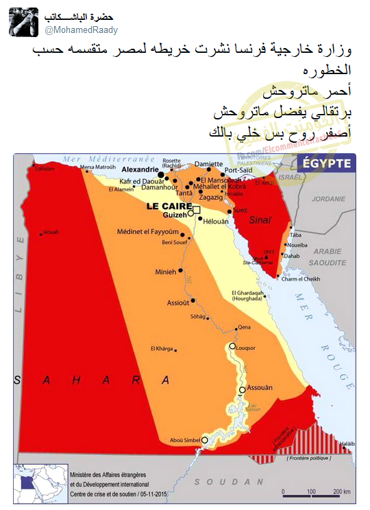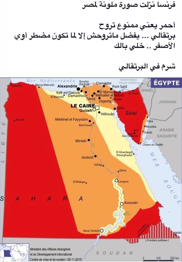 تداولت صحفات مواقع التواصل الاجتماعي خبرا نشرته وزارة الخارجية الفرنسية عبارة عن خريطة مصر مقسمة لعدة ألوان بحسب الخطورة، من أجل تحذير مواطنيها من الاقتراب من المناطق غير الآمنة.