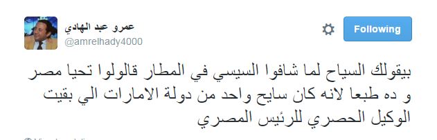 سخر الناشط عمرو عبد الهادي بقوله: “بيقولك السياح لما شافوا السيسي في المطار قالولوا تحيا مصر و ده طبعا لأنه كان سايح واحد من دولة الامارات اللي بقيت الوكيل الحصري للرئيس المصري”.
