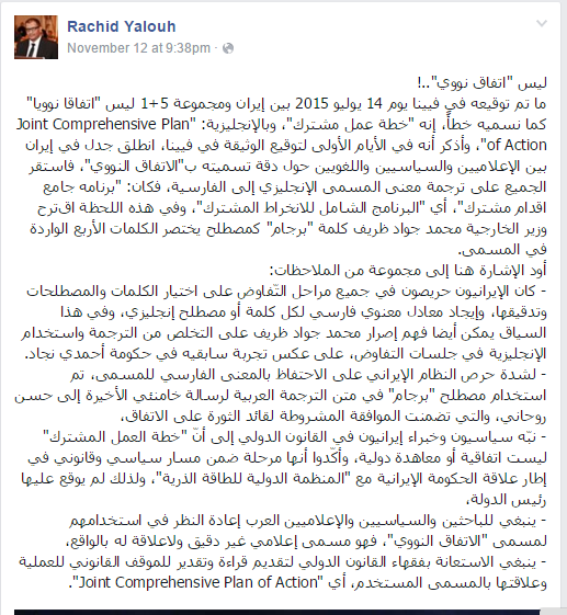 – كان الإيرانيون حريصين في جميع مراحل التّفاوض على اختيار الكلمات والمصطلحات وتدقيقها، وإيجاد معادل معنوي فارسي لكل كلمة أو مصطلح إنجليزي، وفي هذا السياق يمكن أيضًا فهم إصرار محمد جواد ظريف على التخلص من الترجمة واستخدام الإنجليزية في جلسات التفاوض، على عكس تجربة سابقيه في حكومة أحمدي نجاد”.