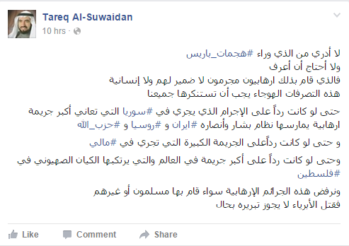 وتابع: “حتى لو كانت ردًا على الإجرام الذي يجري في سوريا التي تعاني أكبر جريمة إرهابية يمارسها نظام بشار وأنصاره إيران وروسيا و حزب الله، وحتى لو كانت ردًّا على الجريمة الكبيرة التي تجري في مالي، وحتى لو كانت ردًا على أكبر جريمة في العالم والتي يرتكبها الكيان الصهيوني في فلسطين”.