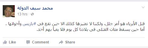 قال الباحث المتخصص في الشأن القومي العربي ورئيس وحركة ثوار ضد الصهيونية، محمد سيف الدولة: إن قتل الأبرياء هو أمر جلل، ولكننا لا نعتبرها كذلك إلا حين تقع فى باريس، وأخواتها.