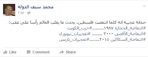 وقال سيف الدولة في منشور آخر: “صدفة عجيبة أنه كلما انتفضت فلسطين، يحدث ما يقلب العالم رأسًا على عقب: #انتفاضة_الحجارة ١٩٨٧………حرب_الكويت