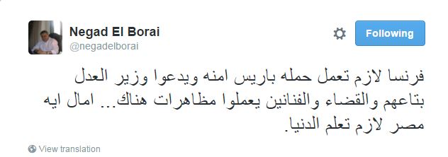 وأضاف -عبر تغريدة له على حسابه على موقع “تويتر”- “يجب على فرنسا تدشين حملة “باريس آمنة”، ويتم دعوة وزير العدل الفرنسي والقضاء والفنانين يعملوا مظاهرات هناك.. أمال إيه مصر لازم تعلم الدنيا”.