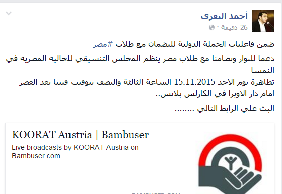 وقال -عبر منشور له على “فيس بوك”-: “ضمن فاعليات الحملة الدولية للتضامن مع طلاب مصردعمًا للثوار وتضامنًا مع طلاب مصر، ينظم المجلس التنسيقي للجالية المصرية في النمسا، تظاهرة، يوم الأحد الساعة الثالثة والنصف بتوقيت فيينا بعد العصر، أمام دار الأوبرا في الكارلس بلاتس”.