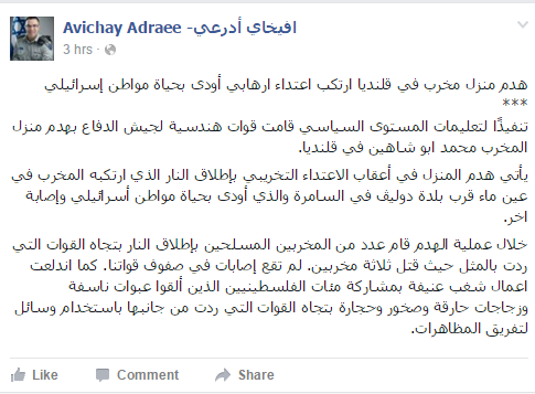 وأضاف أدرعي: إن المواجهات حدثت أثناء قيام قوات الجيش بهدم منزل محمد أبو شاهين المتهم بقتل مستوطن إسرائيلي في يونيو الماضي، مشيرًا إلى أنه لم تقع إصابات في صفوف قوات الجيش، جراء المواجهات التي شارك فيها مئات الفلسطينيين”، موضحًا أن الفلسطينيين ألقوا عبوات ناسفة وزجاجات حارقة وصخور وحجارة تجاه قوات الجيش.