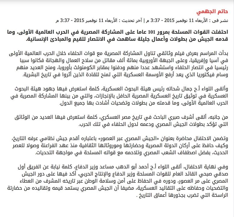 أثار انتباهي خبر غريب نشر في الشروق يوم ١١ نوفمبر ٢٠١٥ عن احتفال القوات المسلحة "بمرور ١٠١ عاما على المشاركة المصرية في الحرب العالمية الأولى، وما قدمه الجيش من بطولات وأعمال جليلة ساهمت في الانتصار للقيم والمبادئ الإنسانية."