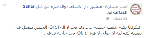 وتداول المغردون إعلان دار الأسلحة والذخيرة، بشيء من السخرية، فقالSahar Elkaffash “افتكرتها نكتة طلعت حقيقة.. دی بجد لا إله إلا الله الجيش بيعمل فی نفسه كده ليه لا حول ولا قوة الا بالله بجد حاجة تقرف”.