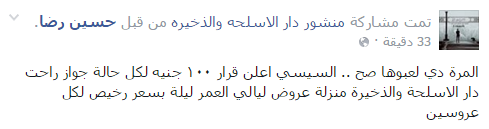 وعلق حسين رضا “المرة دي لعبوها صح .. السيسي أعلن قرار ١٠٠ جنيه لكل حالة جواز راحت دار الأسلحة والذخيرة منزلة عروض ليالي العمر ليلة بسعر رخيص لكل عروسين”.