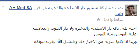 واندهش AH Med SA Lah.قائلا: “…. هي دى دار الأسلحة والذخيرة ولا دار القلوب والدباديب، عليه العوض ومنه العوض وربنا أنا كلها شويه من الأخبار دى وهتشل الله يخرب بيوتكم”.