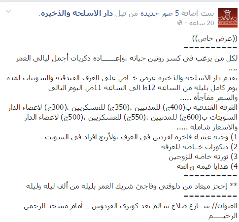 أعلنت دار الأسلحة والذخيرة التابعة للقوات المسلحة والكائنة بشارع صلاح سالم بالقاهرة عن تقديم عروض خاصة على الغرف الفندقية والسويتات لمدة يوم كامل بليلة من الساعة الثانية عشرة ظهرًا وحتى الساعة الحادية عشرة صباح اليوم التالي.