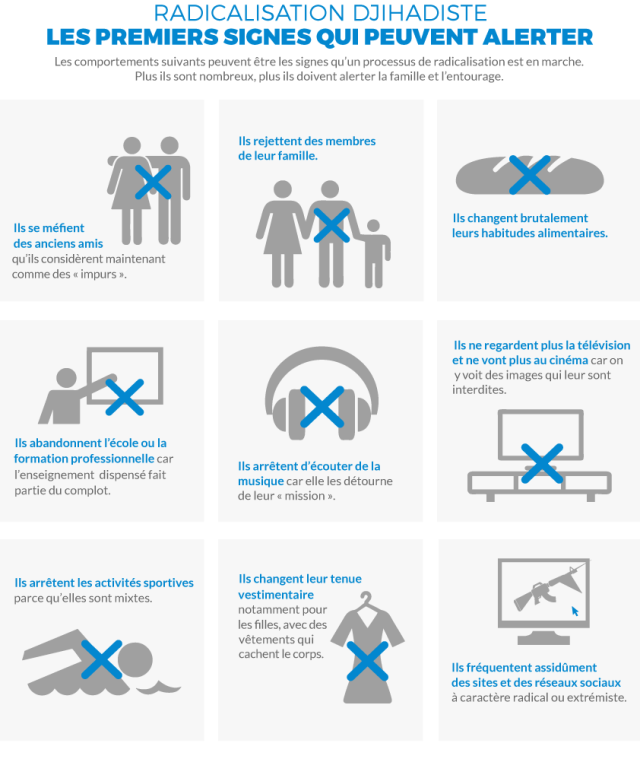 نشرت السلطات الفرنسية عقب اعتداءات مجلة “شالي إيبدو” التي حدثت في أوائل يناير من العام الحالي، إرشادات تحذيرية للتعرف على الإرهابيين المحتملين، وذلك من خلال ملصقات وموقع إلكتروني دشن تحت اسم “Stop Djihadisme”.