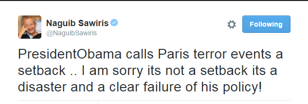 وجه رجل الأعمال نجيب ساويرس، كلمة للرئيس الأميركي باراك أوباما، باللغة الإنجليزية، قائلًا “أنت وصفت الهجمات التي تعرضت لها (باريس) بأنها نكسة، ولكنني أقول لك إنها كارثة، ودليل واضح على فشل سياستك”، على حد قوله.