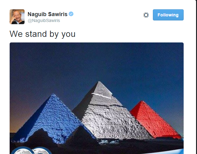 كما توجه -عبر تغريدة أخرى له على “تويتر”- للشعب الفرنسي، باللغة الإنجليزية، قال فيها: “نحن نقف بجانبكم”، ووضع صورة لأهرامات الجيزة وهي مغطاة بالعلم الفرنسي.