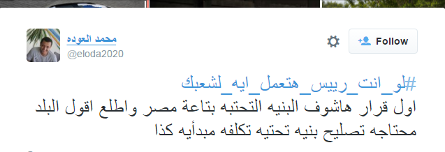 وقال محمد العودة: “أول قرار هاشوف البنية التحتية بتاعة مصر واطلع اقول البلد محتاجة تصليح بنية تحتية تكلفة مبدئية كذا”.