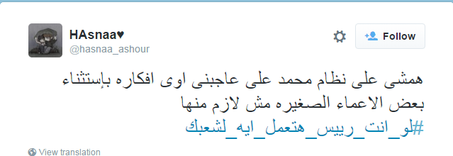 وأكدت hasnaa ashour “همشي على نظام محمد علي عاجبني أوي أفكاره باستثناء بعض الأعمال الصغيرة مش ﻻزم منها”.