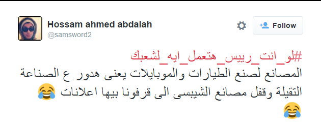 فيما قال Hossam ahmed abdalah: “المصانع لصنع الطيارات والموبايلات يعني هدور على الصناعة التقيلة وهقفل مصانع الشيبسي اللي قرفونا بيها إعلانات”.